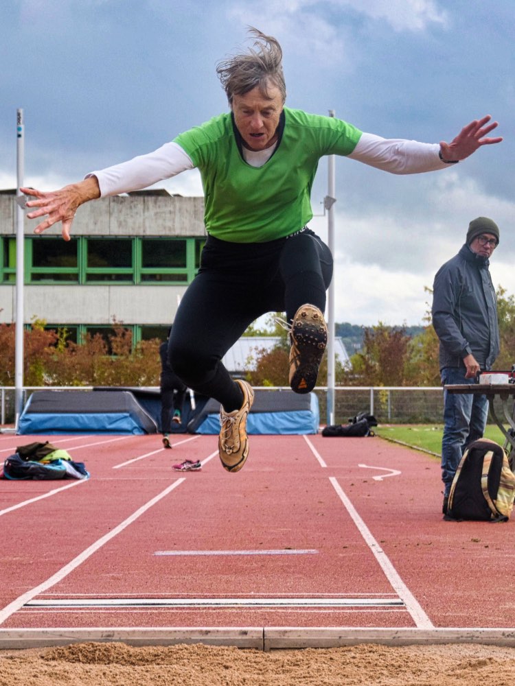 Trotz Kälte und stürmischem Seitenwind war Schoeppe bestens vorbereitet und traf bei allen sechs Versuchen fast perfekt den Absprungbalken. Nach etwas verhaltenen 5,77 Meter beim ersten Anlauf steigerte sich die dynamische Ansbacherin dosiert im Anlauftempo und zog vor allem den zweiten Sprung jeweils risikoreicher länger. Über 5,81 Meter steigerte sich die lebhafte 70-jährige im vierten Durchgang auf 5,93 Meter. Da der Wind nur mit 0,1 m/s von hinten wehte geht diese Weite nun auch in die Rekordlisten des Bayerischen Verbandes ein. Jutta Schoeppe hält nun seit der Altersklasse W45 alle sieben Bayerischen Stabhochsprungrekorde und im Dreisprung die beiden Rekorde der W65 und W70.