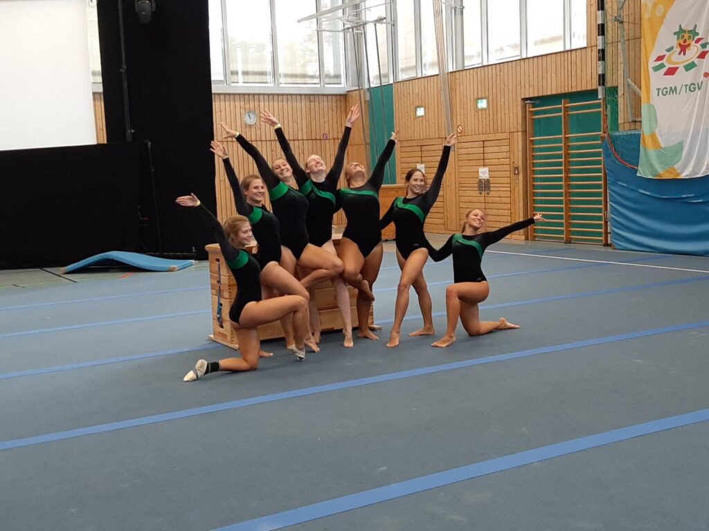 In der Riege TGW-Erwachsene starteten Nina Graf, Kim Grumann, Jessica Hoffmann, Melissa Irg, Mona Irg, Lisa Letzner, Jacqueline McFarland, Pia Nakladal, Jule Nakladal, Rebecca Stroh, Nicole Valuev und Laura Winhart. Auch sie begannen ihren Wettkampf mit der 6 x 50 m Freistilstaffel, die sie auch wie die TGW-Jugend mit 10 Punkten beendeten. Für sie ging es dann zügig weiter zum Turnen. Die mit zahlreichen Schwierigkeiten gespickte, souverän geturnte Boden-Kasten-Übung brachte 9,5 Punkte und mit der sehr kreativen Tanzchoreographie ertanzten sie sich eine stolze 9,9.