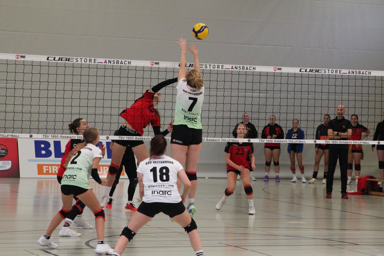 Mit dem ASV Veitsbronn hatte man den Aufsteiger aus der Landesliga zum Gegner, der sich viel vorgenommen hatte. Ansbachs Trainergespann Volker Pauli/Eva Thierauf schickten im ersten Satz folgende Spielerinnen aufs Feld: Zuspiel: Chiara Pauli, Außenangriff: Rosalie Laaß, Nina Hoefer, Mittelblock: Maya Emmert, Vera Marchegiani, auf der Diagonalen Mila Engel und als Libera Aljana Rutkowski.